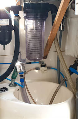 - A pressure relief valve. This is a small button on top of the filter housing, in our installation we don't only use it to relief the residual pressure before screwing off the bowl, but also to release the trapped air after filter maintenance. Instead of forcing the unavoidable pocket of air in the top of the filter housing through the water maker, we hold this button until all the air has escaped.